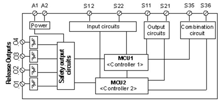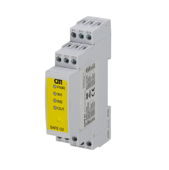 Sicherheitsnachschaltgerät für Nothalt- und Schutztürwächter, BWS Typ II und Typ IV, Sicherheitsleisten und Sicherheitsmatten bis Kat. 4 / PL e nach EN ISO 13849-1. Das Gerät ist für einen ein- oder zweikanaligen Betrieb konzipiert. Weiter kann es wahlweise mit und ohne Überwachung der Starttaste konfiguriert werden. Das Gerät ist in der folgenden Betriebsspannung verfügbar: 24 VDC.