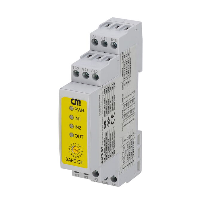 Sicherheitsnachschaltgerät für Nothalt- und Schutztürwächter, BWS Typ II und Typ IV, Sicherheitsleisten und Sicherheitsmatten mit Schaltverzögerung bis Kat. 4 / PL e nach EN ISO 13849-1. Das Gerät ist wählbar mit zuschaltbarer Zeitverzögerung von 0,1s bis 30s (abfallverzögert). Es ist für einen ein- oder zweikanaligen Betrieb konzipiert. Weiter kann es wahlweise mit und ohne Überwachung der Starttaste konfiguriert werden. Das Gerät ist in der folgenden Betriebsspannung verfügbar: 24 VDC.